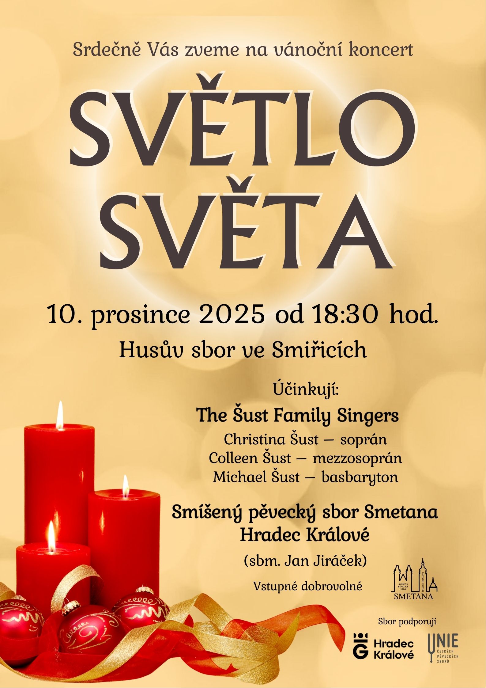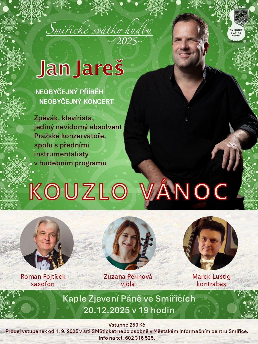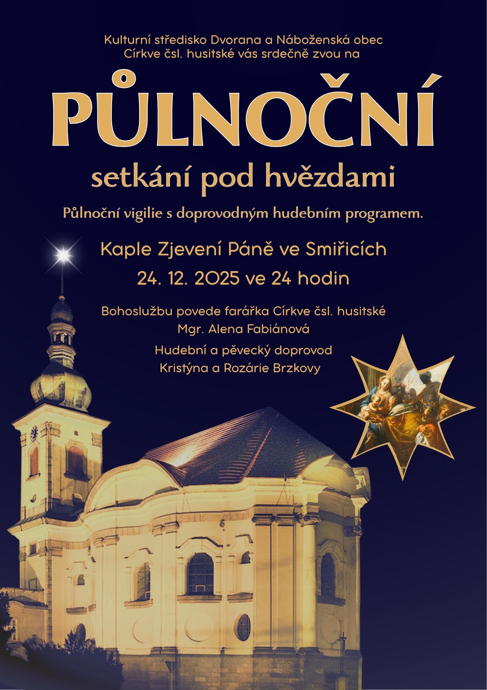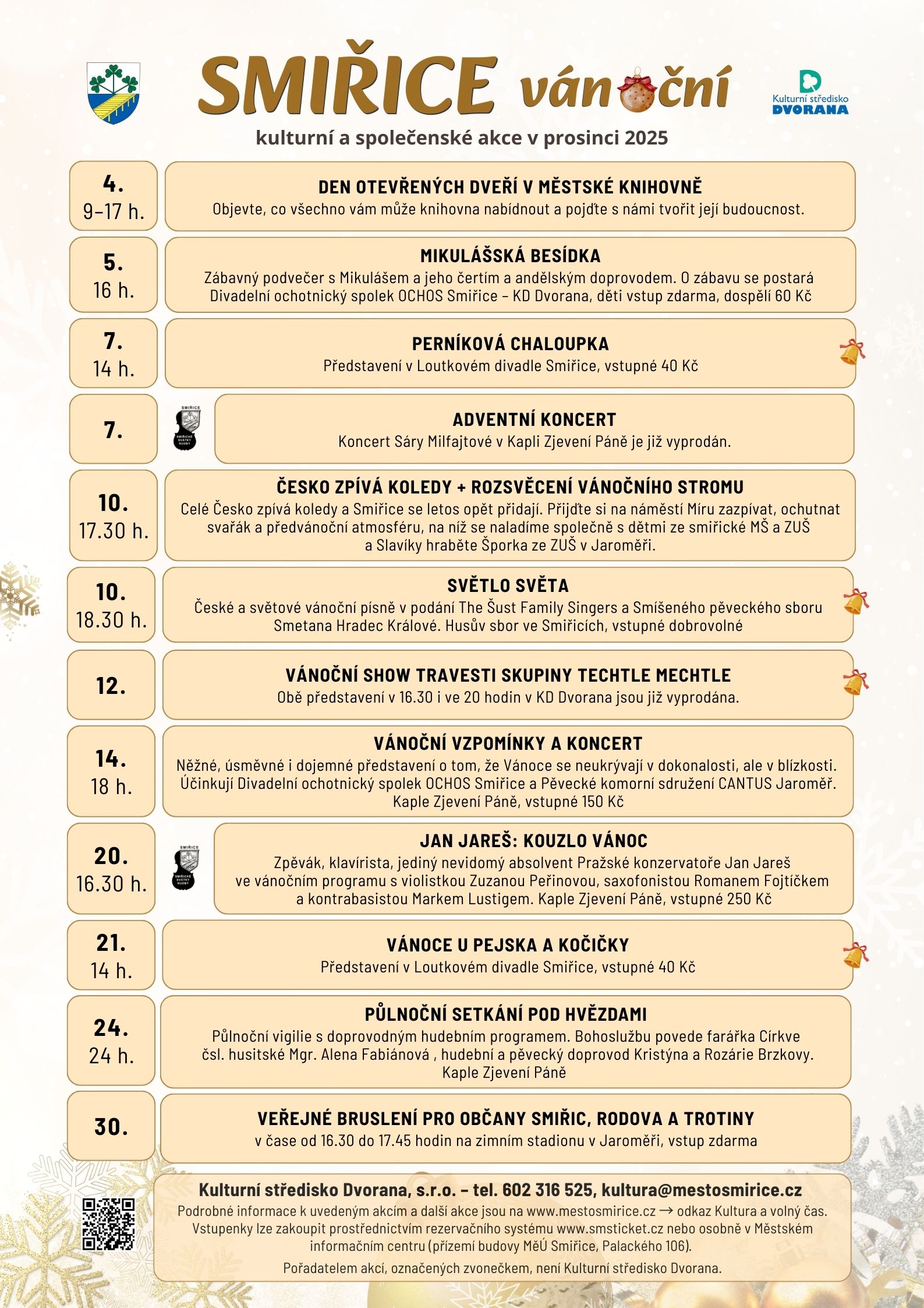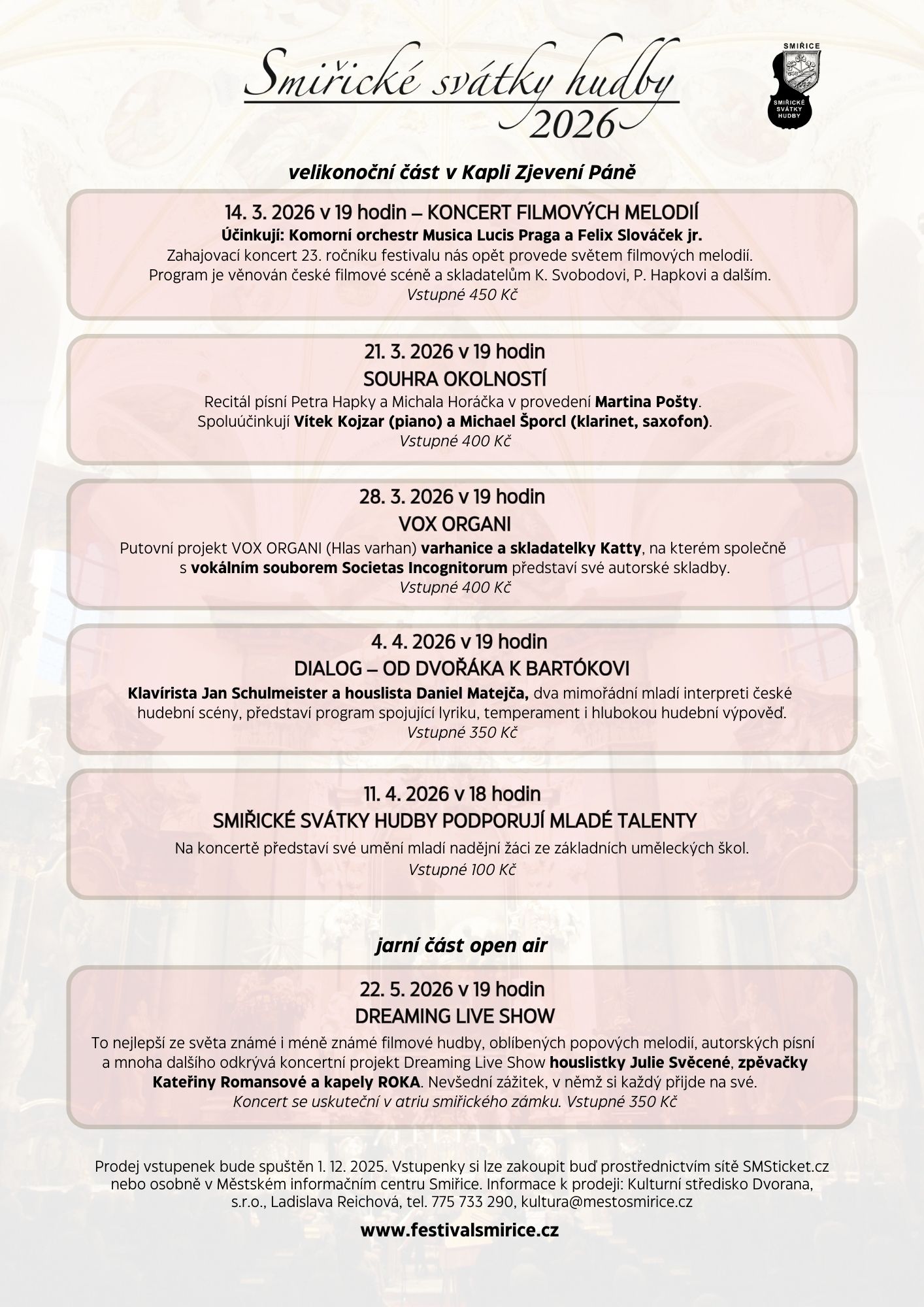 Kulturní středisko Dvorana Vás zve do Smiřic na prosincové vánoční kulturní akce na velikonoční část festivalu Smiřické svátky hudby 2026.