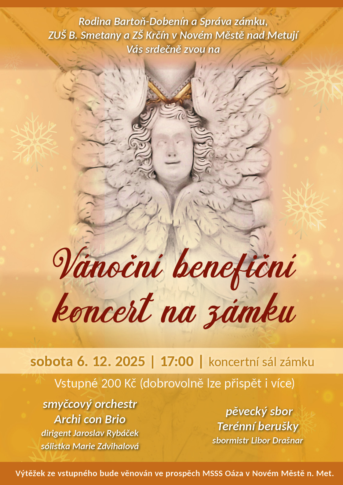 Velký sál novoměstského zámku se i letos rozezní hudbou a naplní sváteční atmosférou – tradiční Vánoční benefiční koncert se uskuteční v sobotu 6. prosince od 17 hodin. V průběhu večera se představí pěvecký sbor Terénní berušky pod vedením sbormistra Libora Drašnara a smyčcový orchestr Archi con Brio pod taktovkou dirigenta Jaroslava Rybáčka. Program zpestří také vystoupení talentované houslové sólistky Marie Zdvihalové. Výtěžek z koncertu bude věnován Městskému středisku sociálních služeb Oáza. Přijďte se zaposlouchat do krásné hudby v zámeckých prostorách a zároveň podpořit dobrou věc!