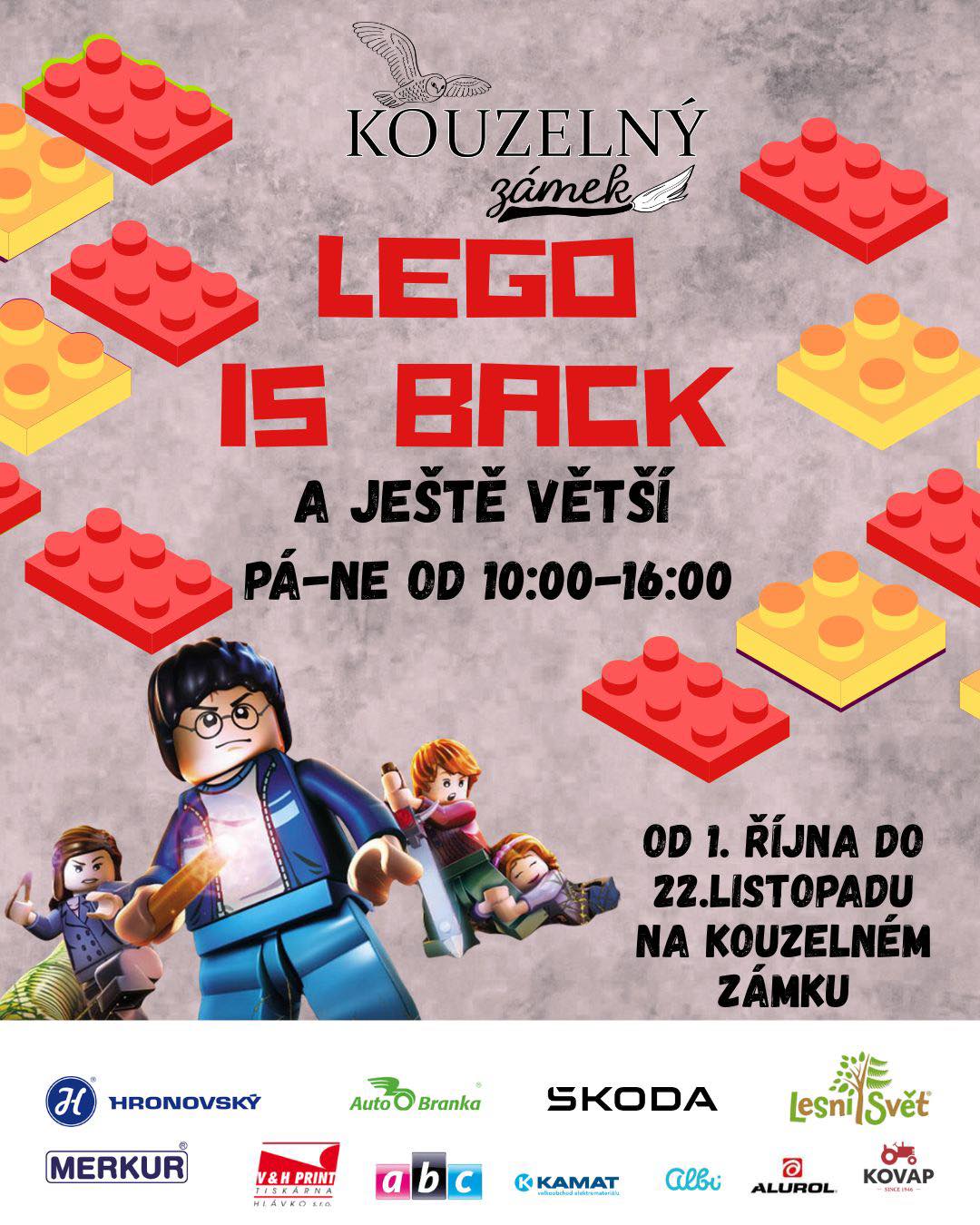 Až do 22. listopadu Vás každý pátek, sobotu a neděli od 10 do 16 hod. zveme na návštěvu světa čaroděje Percivala. V rámci stálé instalace „Kouzelný zámek“ nahlédnete do jeho alchymistické pracovny, tajemné kanceláře či výrobny košťat. Výstavu doplňuje dočasná expozice LEGO IS BACK, která potěší všechny milovníky této ikonické stavebnice bez ohledu na věk.