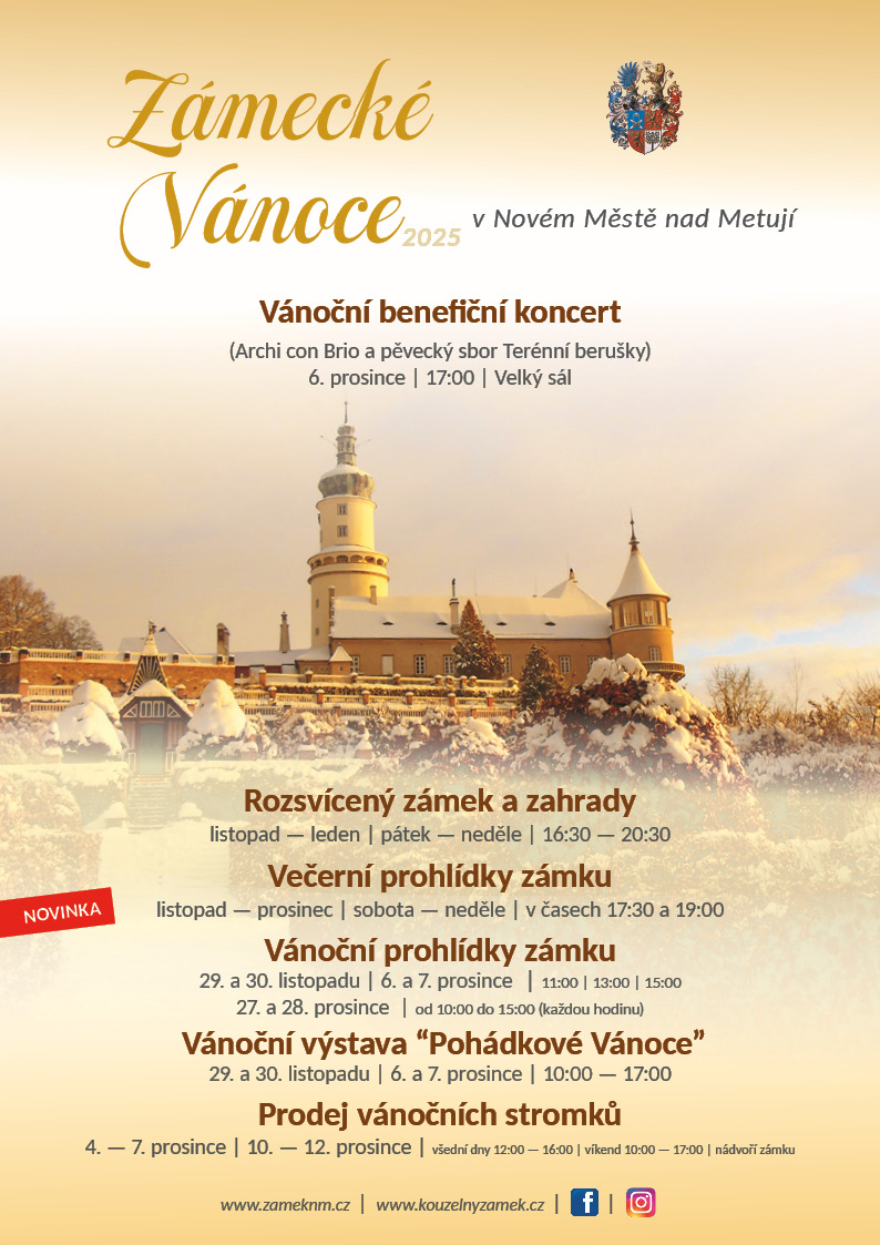 letní turistická sezóna sice skončila, ale novoměstský zámek žije dál! Přijďte si užít jeho kouzlo i během podzimních a zimních měsíců – čekají vás večerní prohlídky, rozsvícené zahrady, Vánoční výstava Pohádkové Vánoce nebo Vánoční benefiční koncert.
